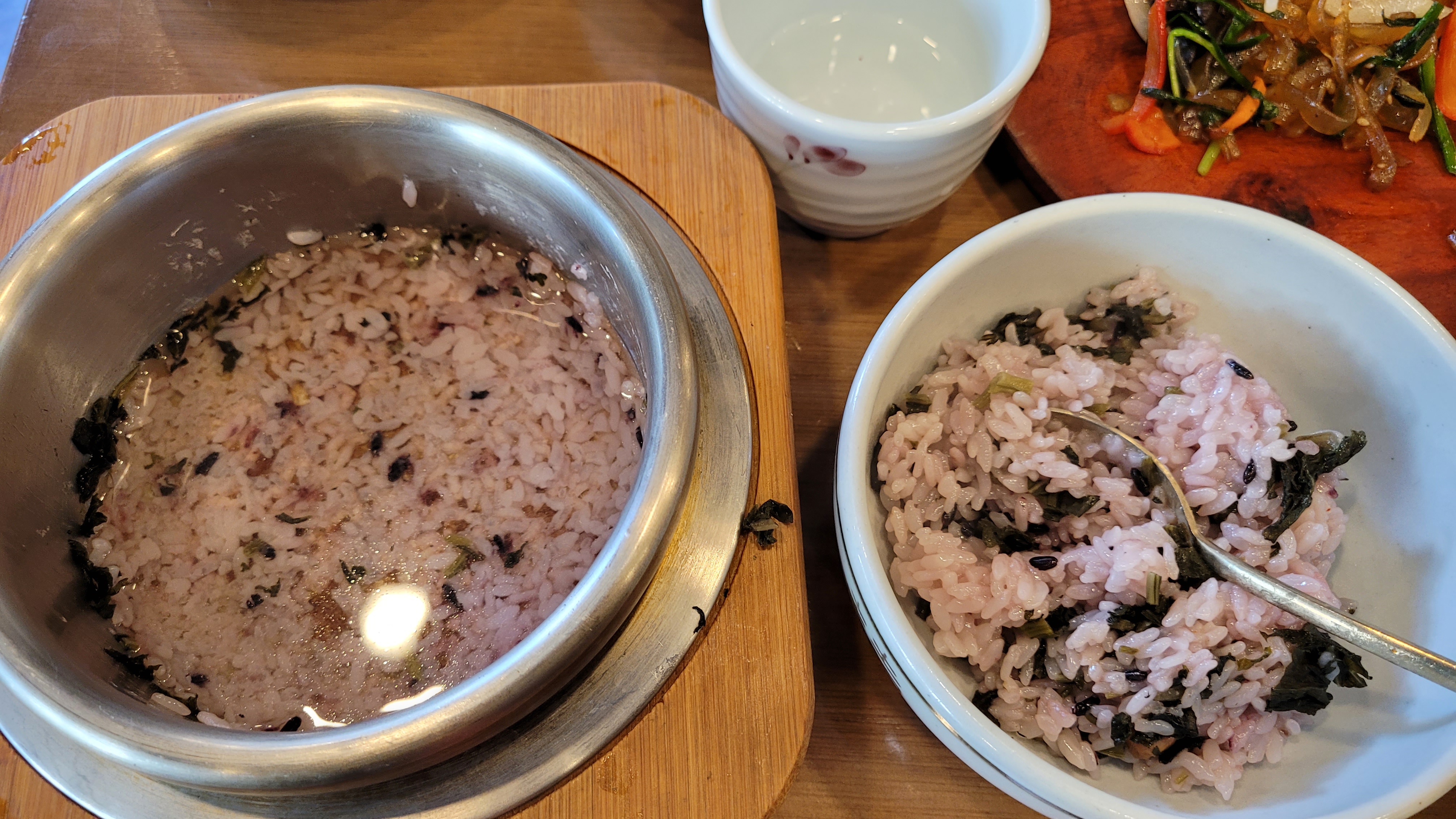 곤드레밥을 양념에 비벼서 맛있게 먹고, 밥을 좀 더 남겨서 누룽지를 만들어서 먹는 스킬, 난 누룽지가 좋다.