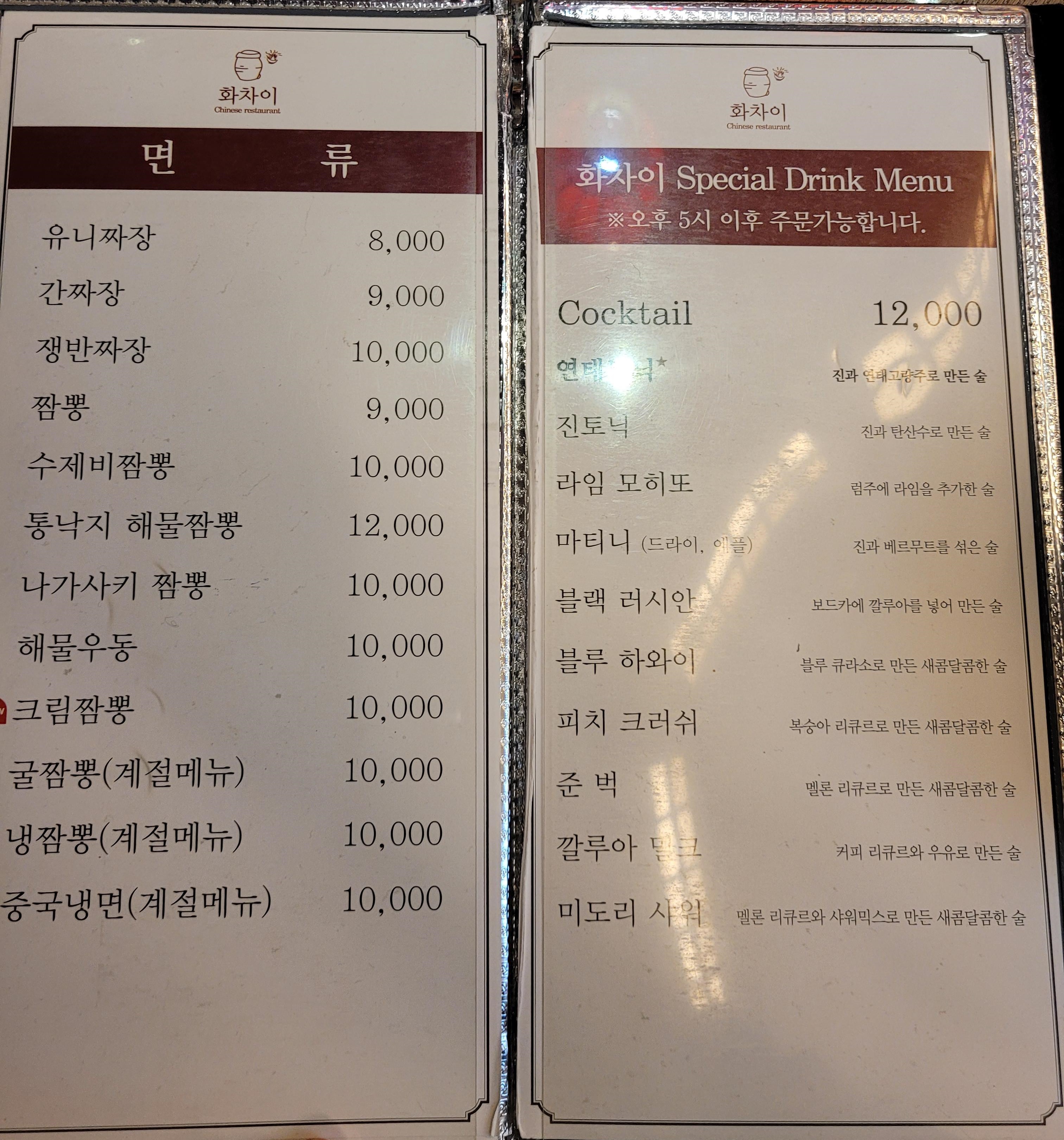 - 유니짜장면 : 6,000원, 볶음밥 : 7,000원, 크림새우(소) : 25,000원