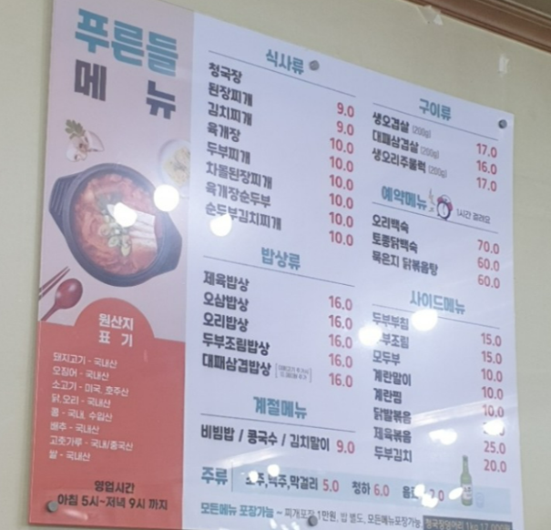 - 청국장 : 9,000원, 된장찌개 9,000원, 김치찌개 10,000원