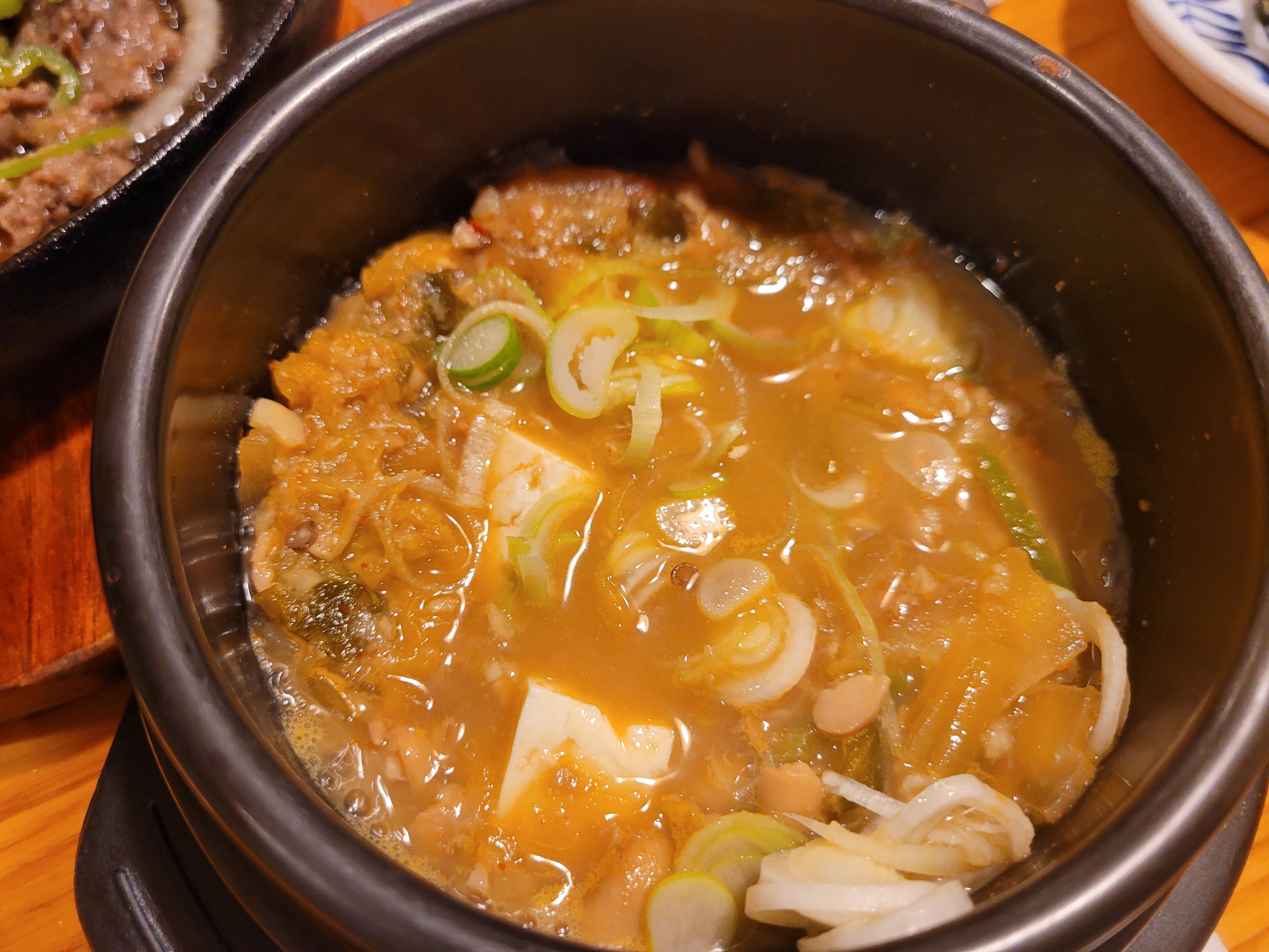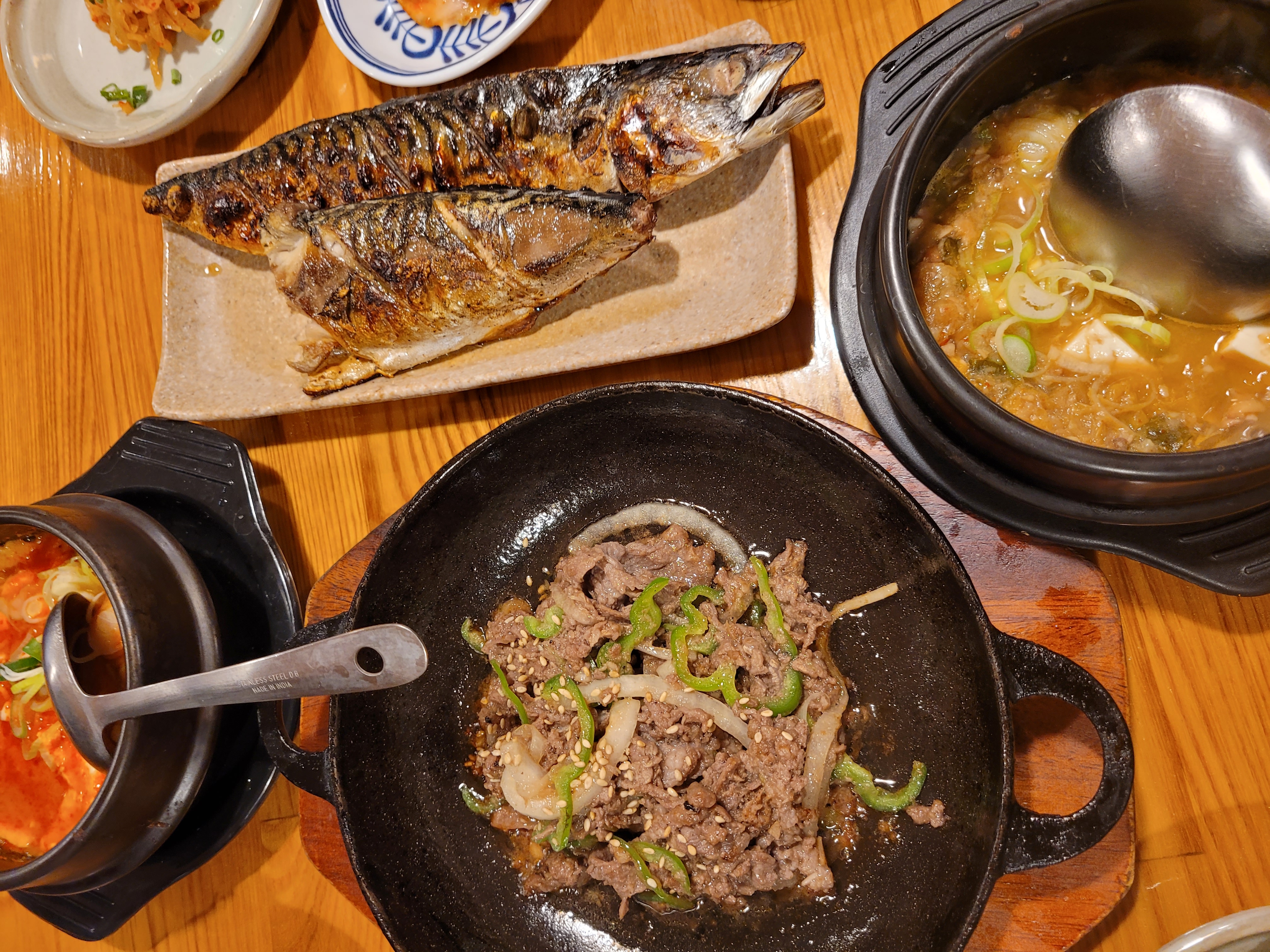 반찬들이 나오는데 모두 풀 종류인데 맛깔스럽게는 생겼다. 두번째로 메인요리가 나오는데 소고기볶음과 고등어구이, 찌개류 2개 정도였다. 생각보다 반찬의 종류(메인요리)가 적었다. 찌개의 양도 적었다