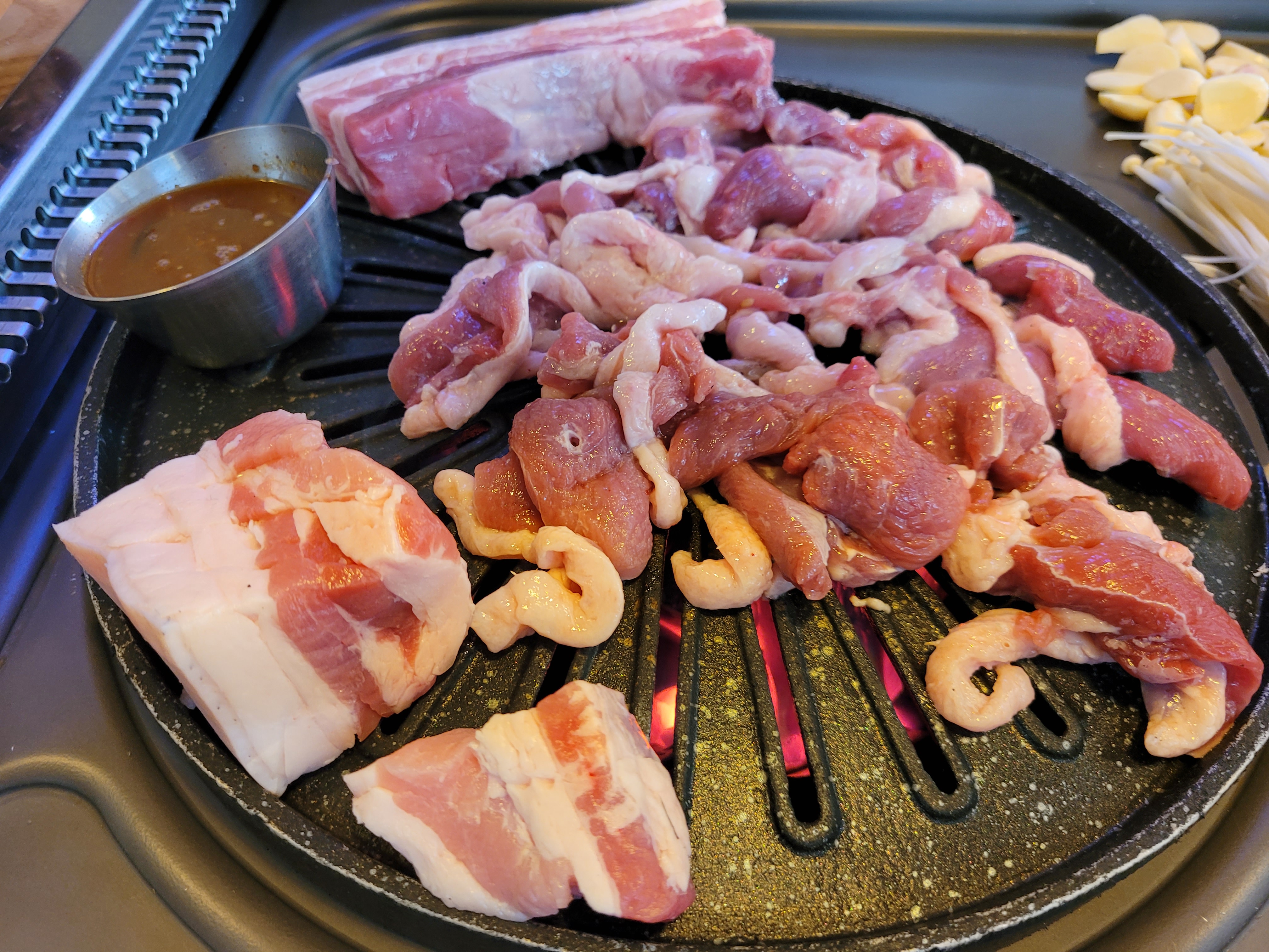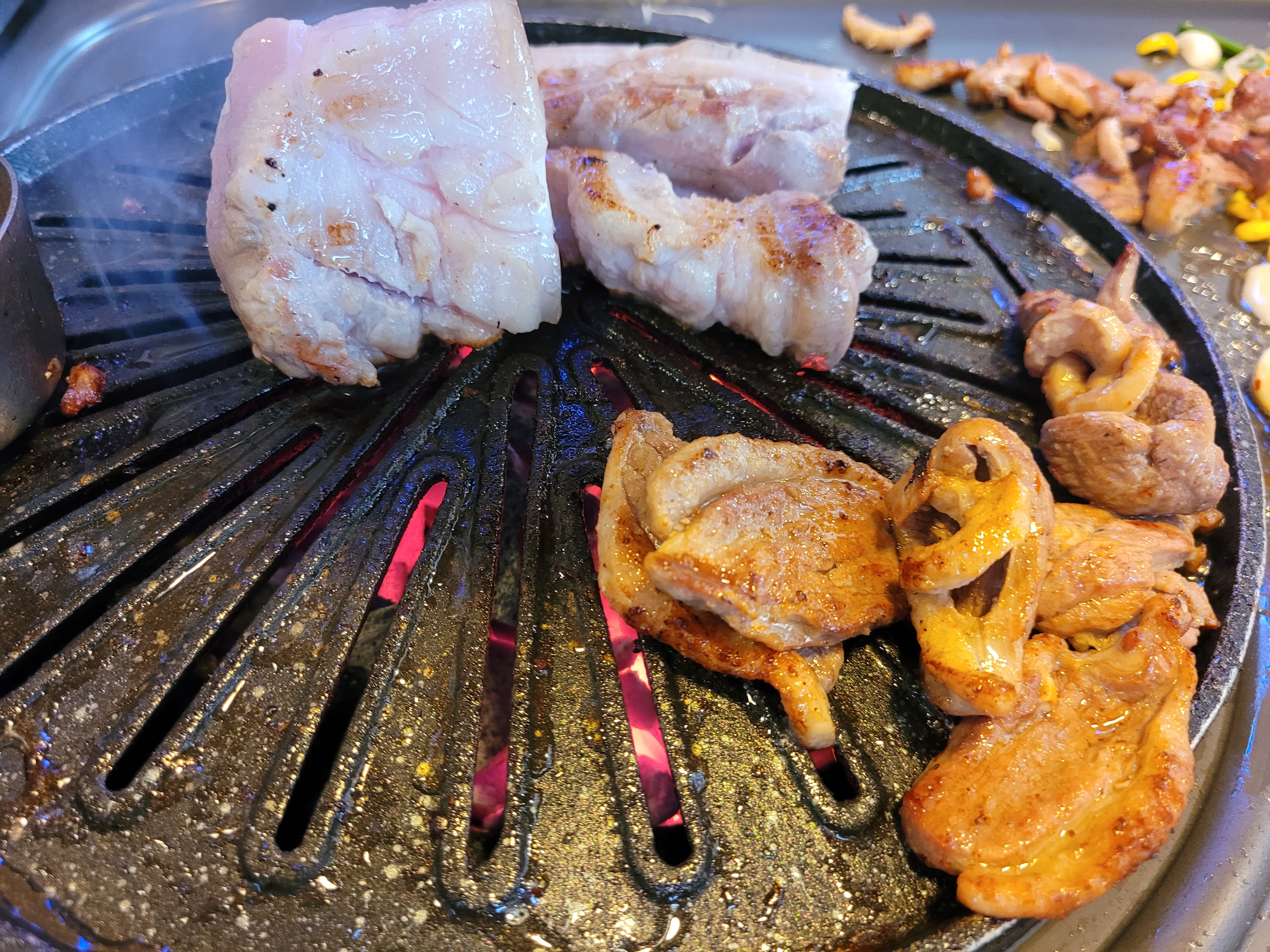 특이한 불판(고기 굽는 판과, 김치와 콩나물 굽는 판이 따로 따로)에 제주도의 흙돼지와 생오리 로스를 잘 구워서 먹으면 고기 사이의 육즙이 배겨나와 배고픔의 해결뿐 아니라 맛있음의 신세계로 우리를 인도한다.