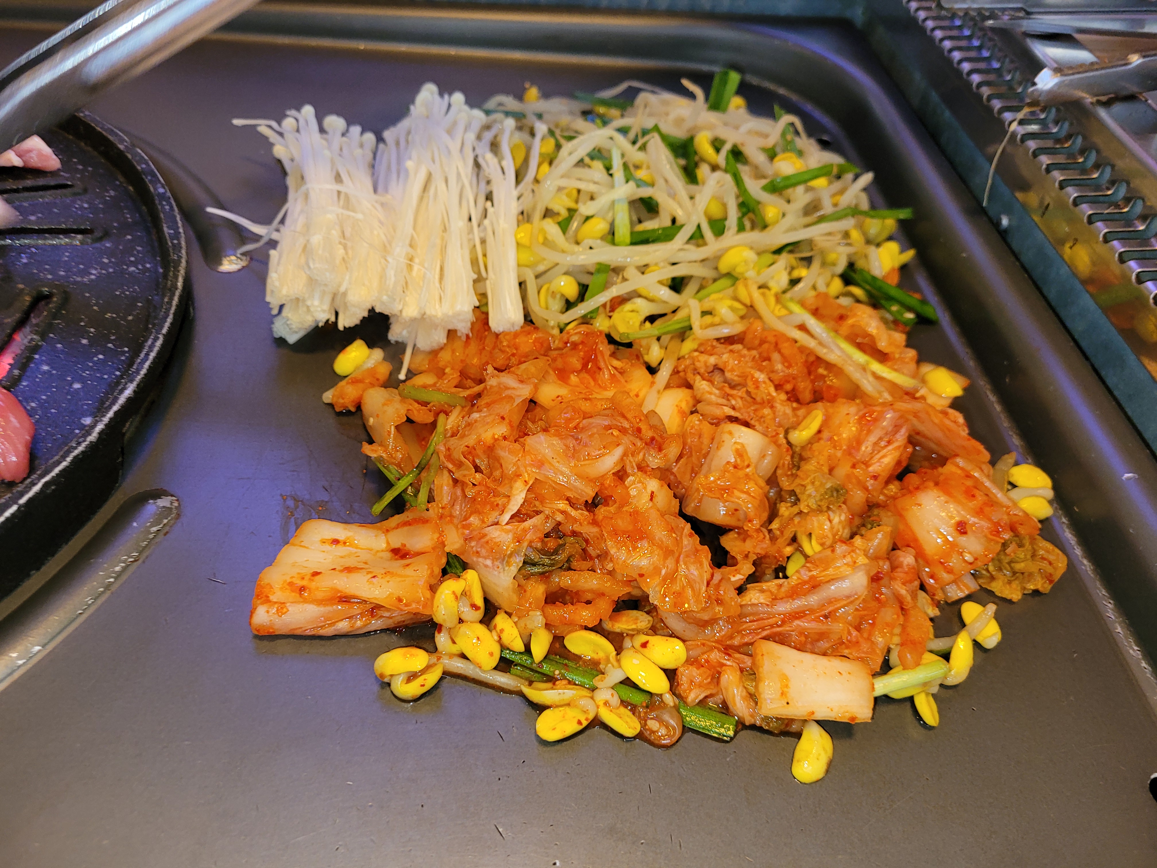 숯불이 들어오고, 네모 판에 김치와 콩나물, 팽이버섯이 셋팅되었다.