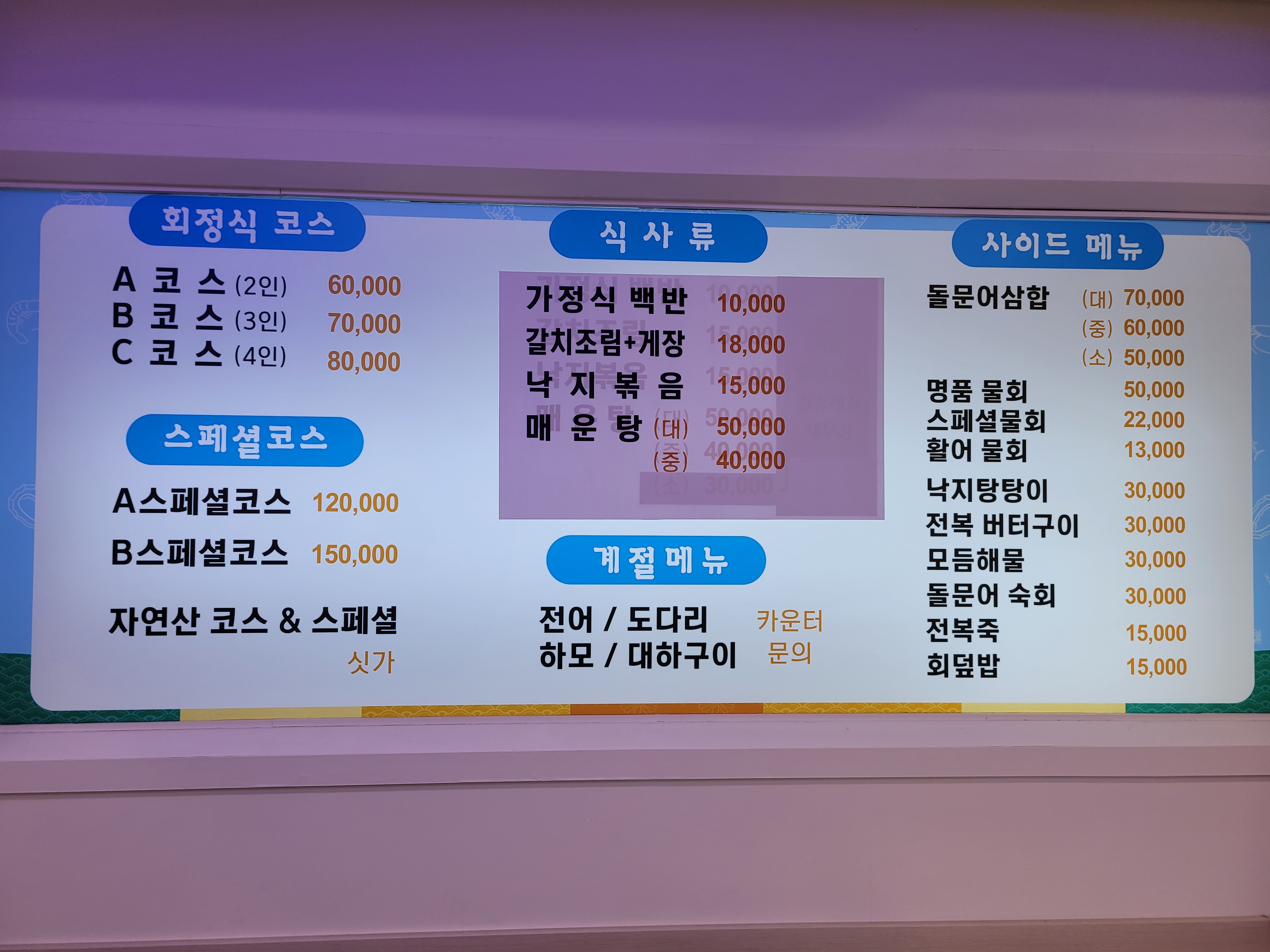 - 가정식 백반 : 10,000원, 갈치조림 : 15,000원, 낚지볶음 - 15,000