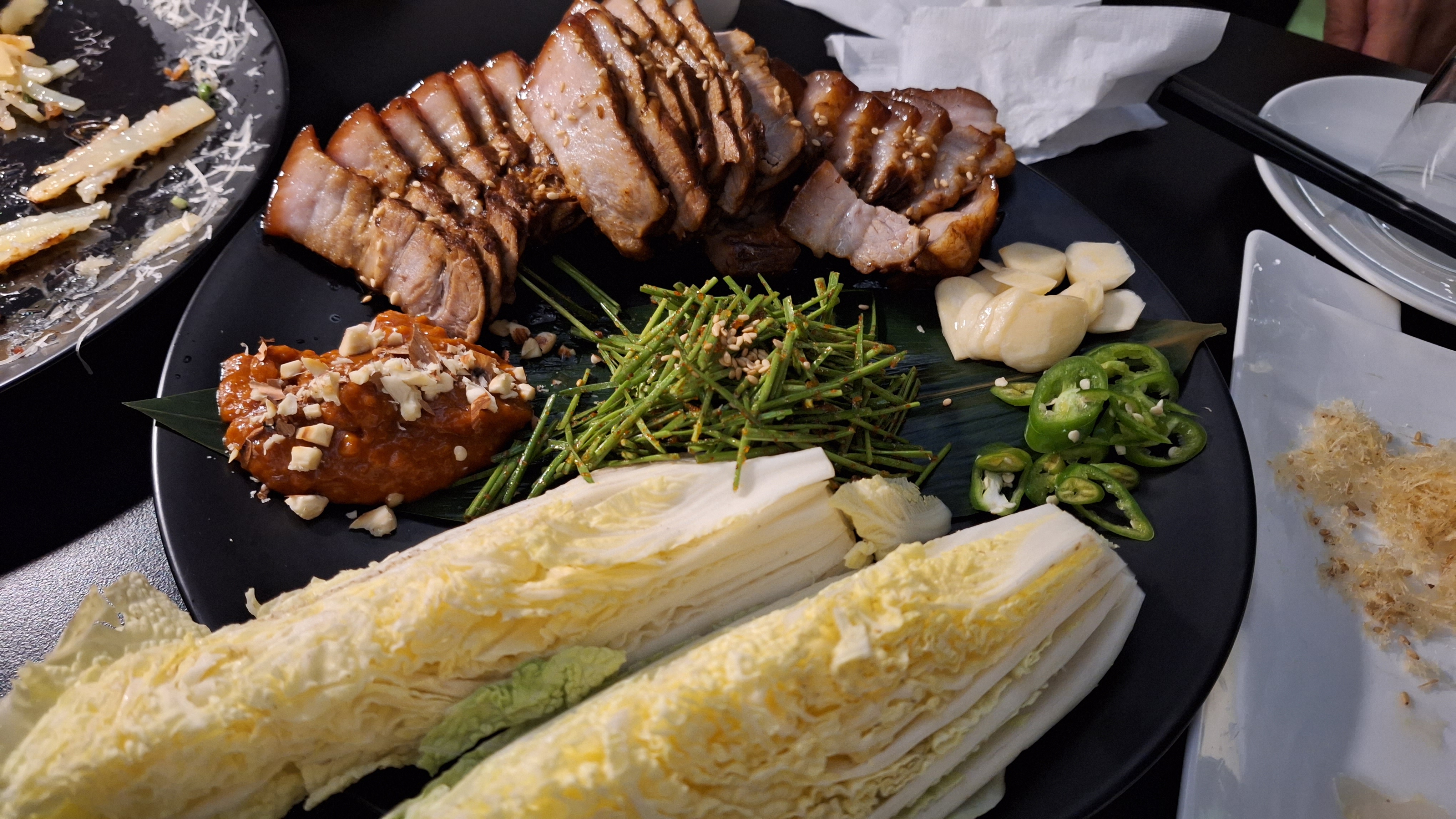 수육 : 제주산 돼지 오겹살, 알배추, 수제 쌈장, 아몬드, 부추 무침