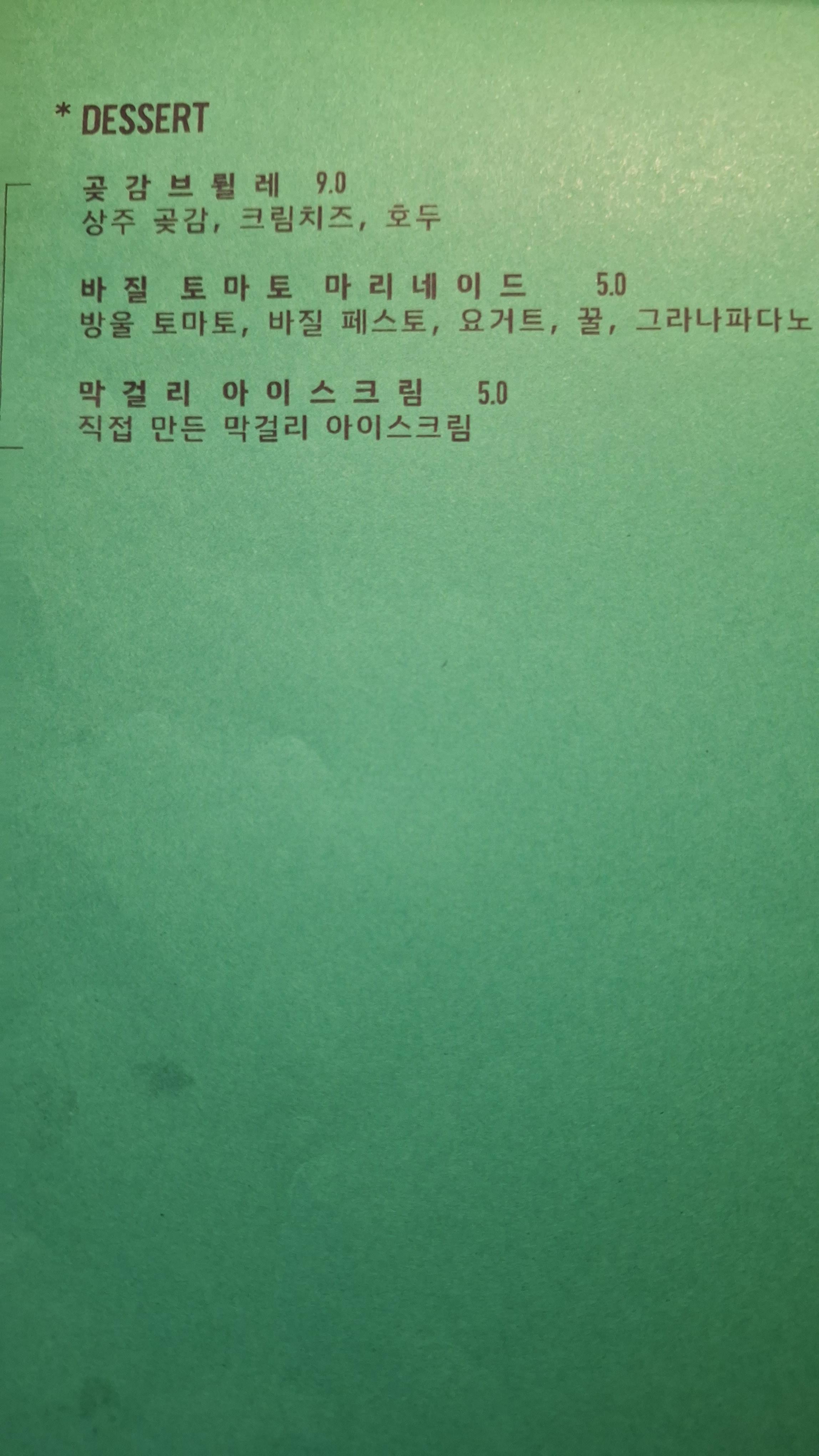 - SIDE : 감태주먹밥(16.0), 지슬채전(17.0), 탕국(25.0), 미나리 갈치 속젓 파스타(18.0) 등
