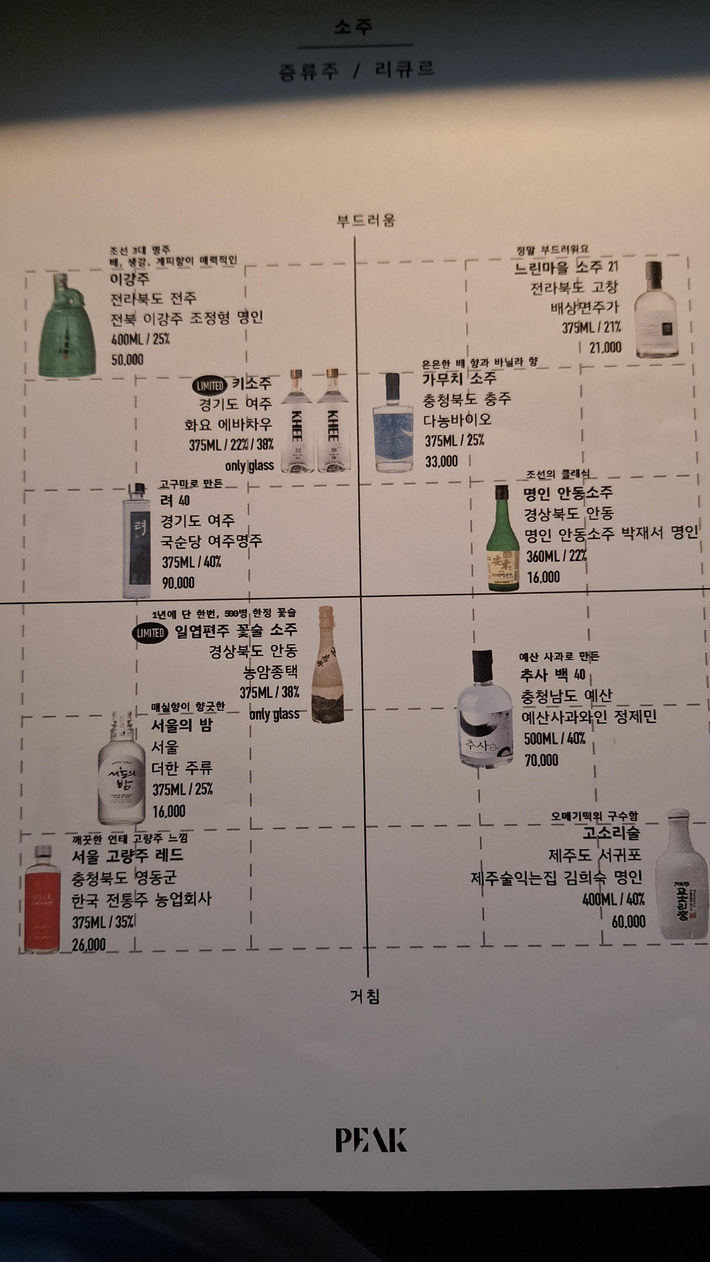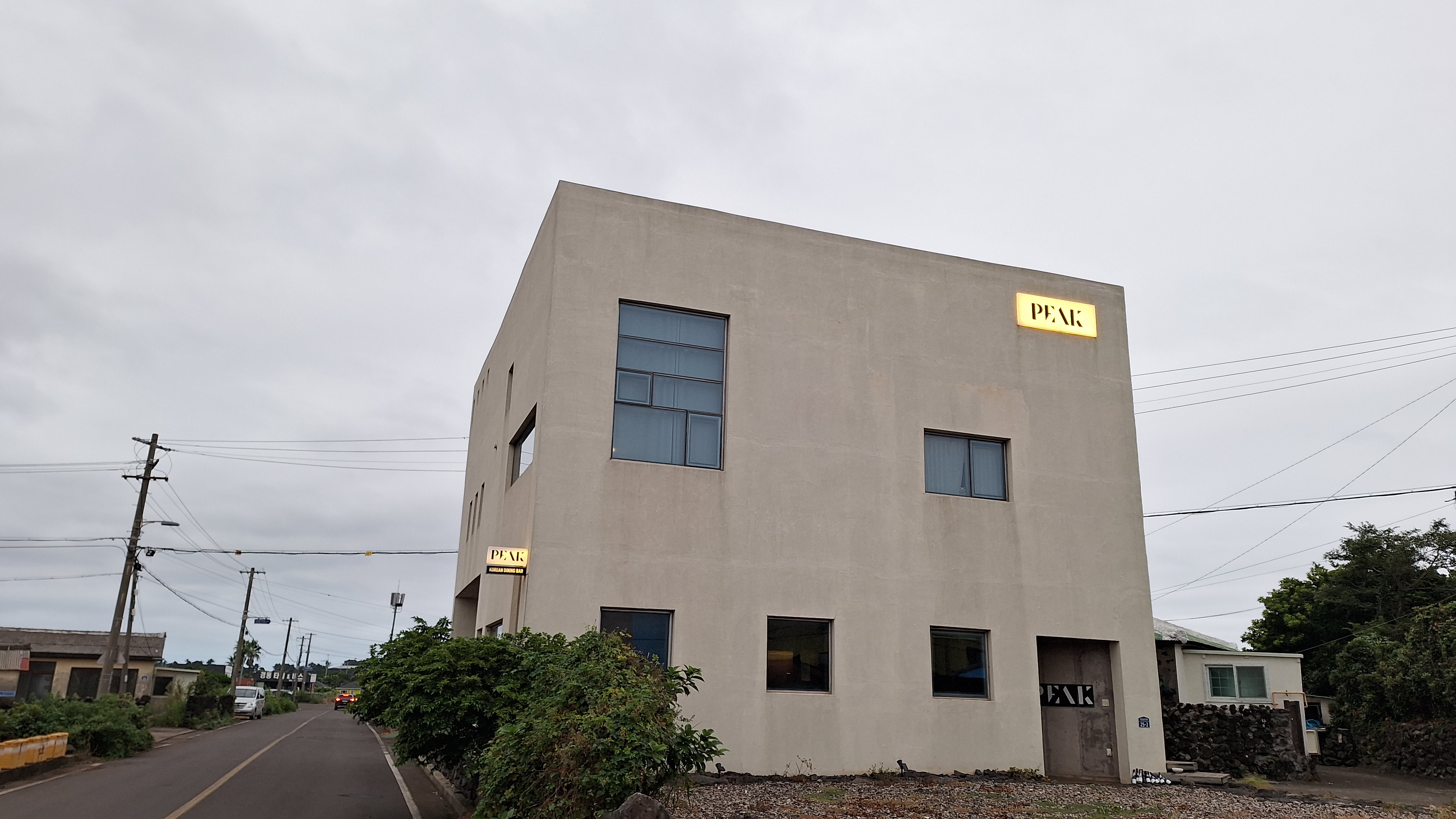 : 성산일출봉에서 약 10분 거리의 시흥리 시골마을에 주위의 고즈넉하고 시골스러운 분위기와 전혀 어울리지 않은 하얀 건물의 PEAK가 서 있었다. 들어가는 입구가 길에서 안쪽으로 들어가야만 있어서 조금 혼동스럽고, 들어갔을때 약간 어두운 조명이었지만 모던하고 심플하고 데이트하기 좋은 분위기였다. 약간 좁다는 느낌이 있지만 적당한 자리배치로 복잡하진 않았다. 음식 맛이 좋았고, 두 부부가 하는 것 같은데 아주 친절해서 좋았다. 단, 일반 소주를 판매하지 않아 술값이 조금 비싸기는 하지만 그래도 좋았다.