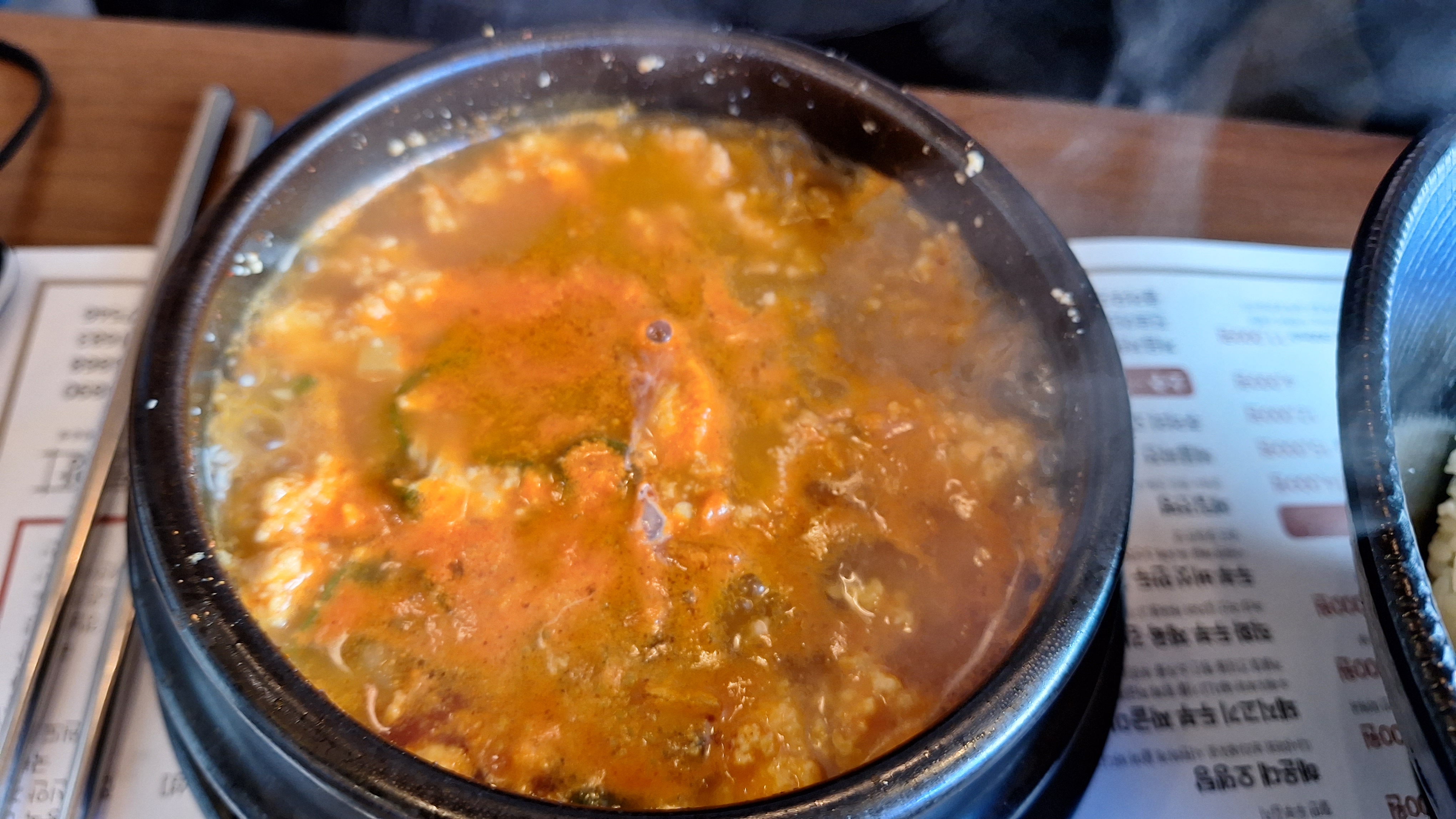 식당 앞 주차장에는 몇 대 주차할 수가 없었다. 그나마 이상한 분이 차를 잘못 주차해서 식당에 내려주고 주차를 하러 갔다. 오픈하지 않는 근처 가게 앞에 주차를 하고 식당안으로 들어갔다. 생각한 것 보다는 고급스러운 실내 장식, 일찍 왔지만 이미 꽉 찬 식당, 맛집이구나 하는 생각이 들었다. 한자리 남아서 바로 자리에 앉고 키오스크로 얼큰순부두, 굴짬뽕순두부, 직화구이 간장불구이를 주문했다. 주문한 지 10분 정도 지나니 보글보글 찌개와 맛있는 고기를 우리 자리로 가져왔다. 한 숟가락 순두부찌개를 떠 먹는 순간 우리 딸이 외치는 소리 "와!!! 대청마루와 똑같은 맛이다", 그 소리만 듣고도 나는 행복했다. ^^