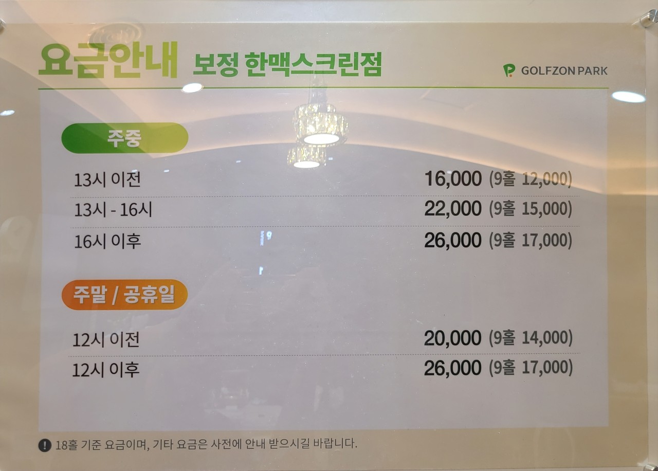 - 위의 가격표 보면 아시겠지만, 동네라서 그런지 저렴합니다. 저는 보통 주말 12시 이전에 플레이를 해서 2만원에 게임을 합니다. 회사 근처의 스크린 골프장에 비해 상당히 저렴합니다.