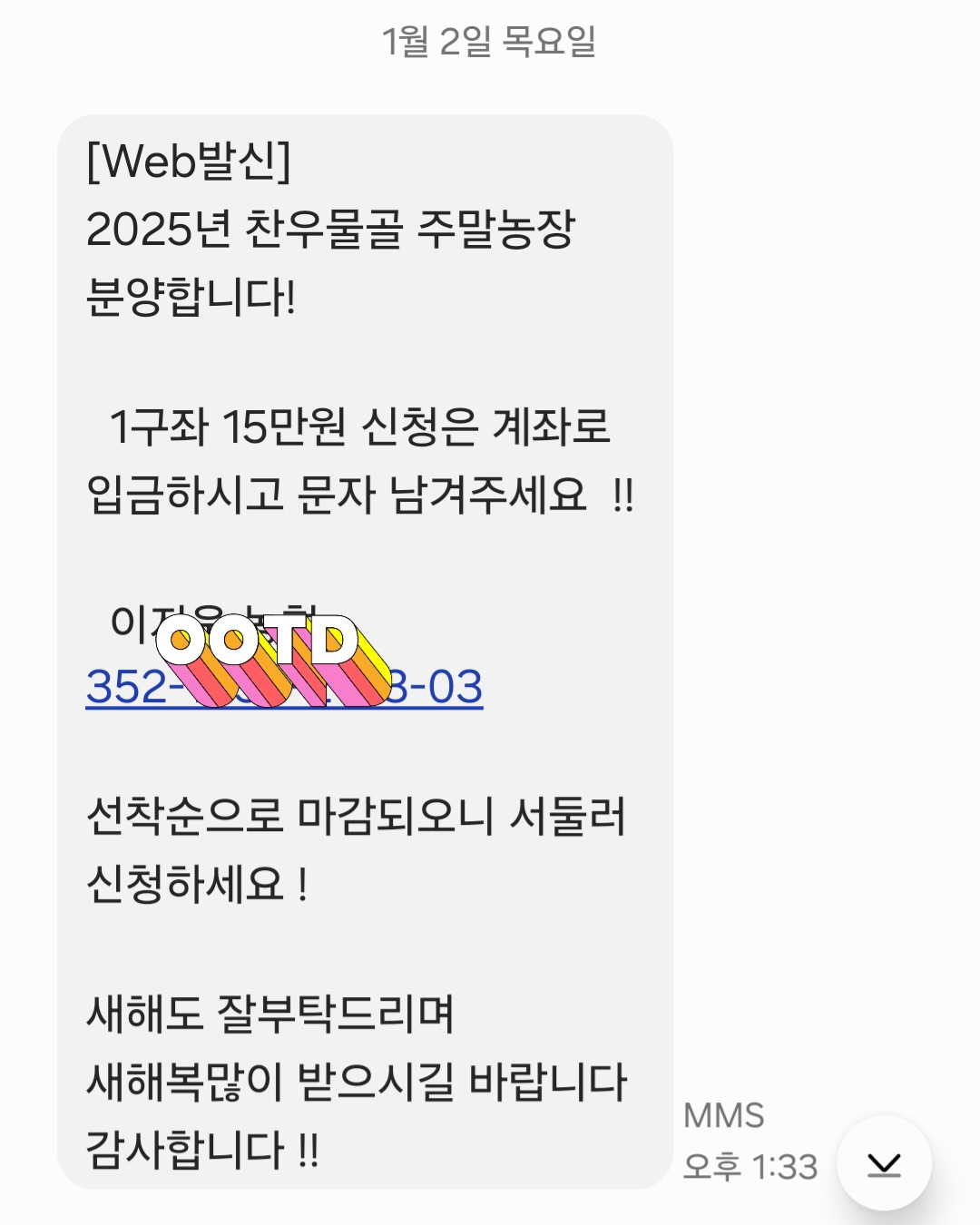 보통 다른 해에는 1월 13~4일에 분양 메시지가 왔었는데, 올해는 새해가 되자마자 1월 2일에 메시지가 왔습니다. 그래서 고민하지 않고 매년 분양받은 것처럼 2구좌를 받았습니다.