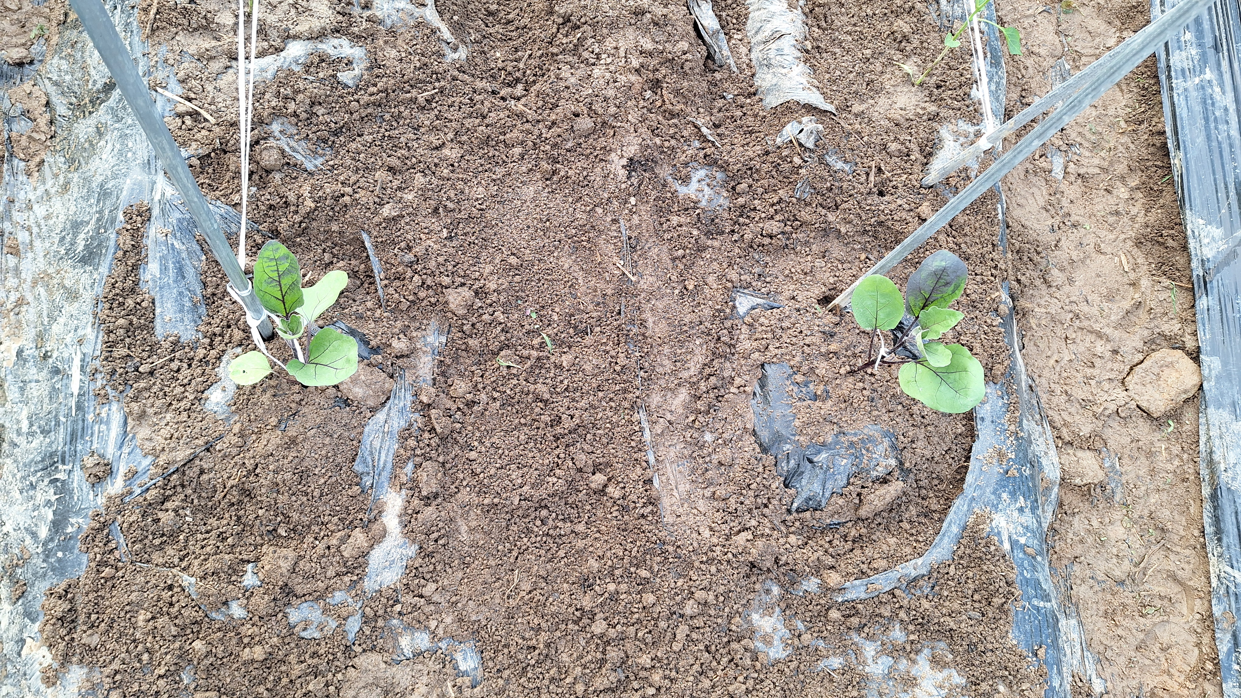 [가지] 가지는 모종을 심을 때 방울토마토 반 높이까지 즉 뿌리부터 첫번째 잎 절반 정도로 모종을 심습니다.