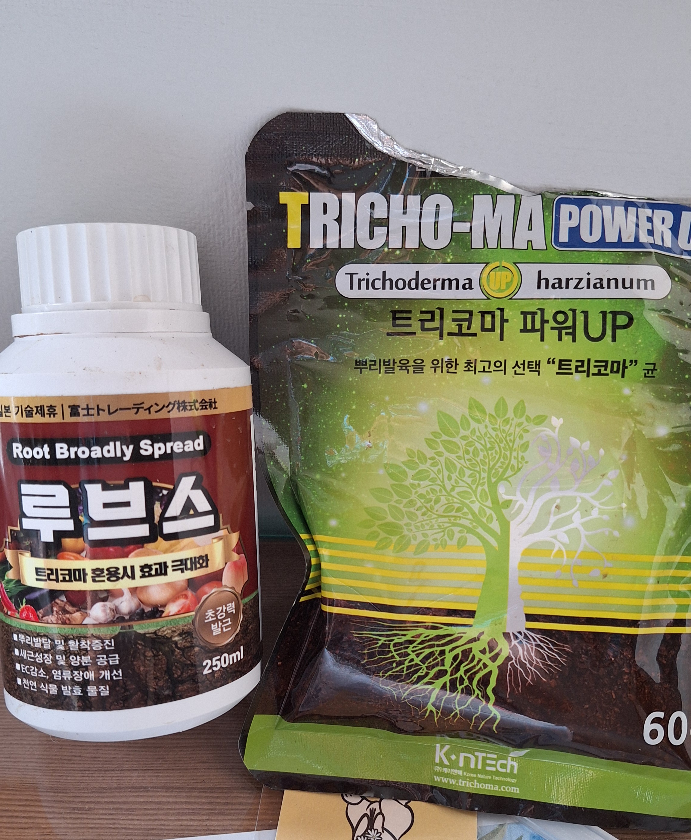 제품은 루부스와 트리코마인데 같이 섞어주면 더 건강하게 키울 수 있다고 합니다. 미생물 활동을 촉진시켜 원뿌리를 좋게 하는 '루부스'와 항균 물질인 '트리코마'입니다. 모종을 담그는 '뿌리침지' 시에는 물 20 리터에 루부스 40ml, 트리코마 40g 기준으로 희석시켜 사용합니다. 저는 모종의 갯수가 적기 때문에 물 400ml 기준으로 루부스와 트리코마 양을 치환해서 줄여(약 1ml, 1g 정도) 사용했습니다.