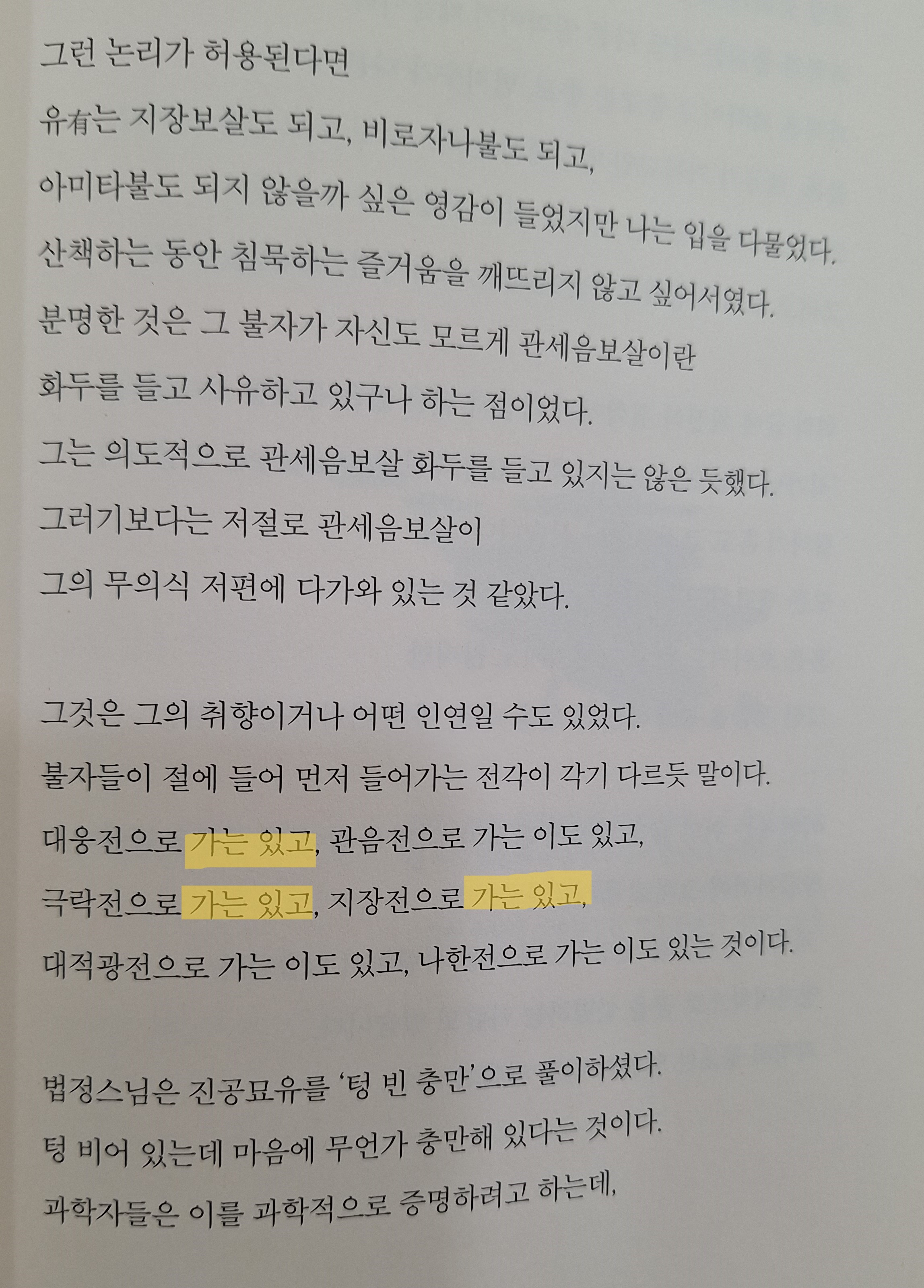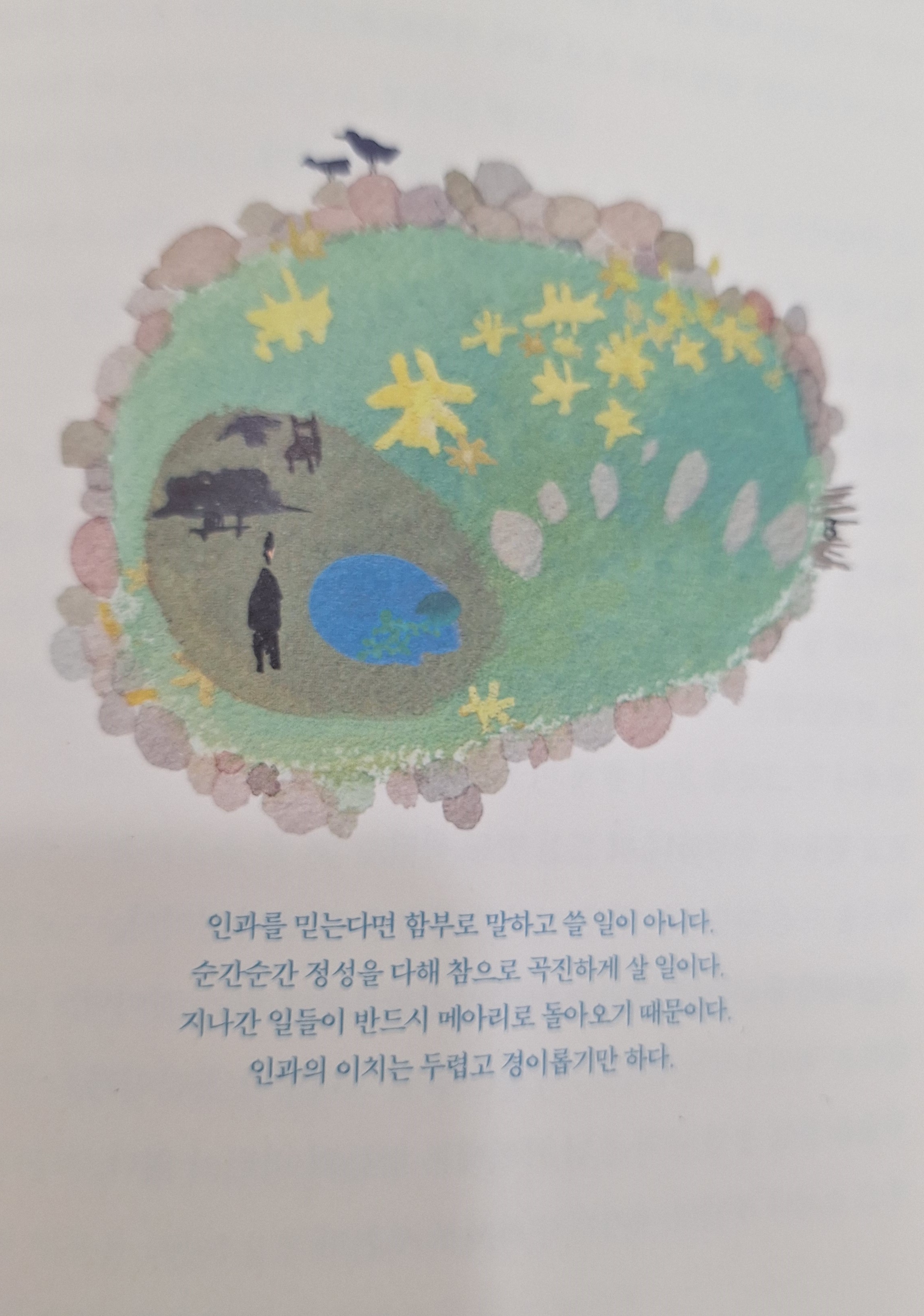 (그렇다) 인과를 믿는다면 함부로 쓸 일이 아니다. 순간순간 정성을 다해 참으로 곡진하게 살 일이다. 지나간 일들이 반드시 메아리로 돌아오기 때문이다. 인과의 이치는 두렵고 경이롭기만 하다.