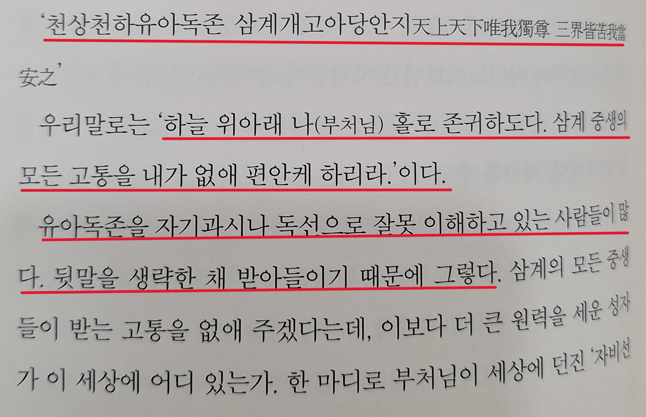 (불교가 무엇입니까?) 나는 신도들에게 들려주는 얘기를 똑같이 반복했다. "나를 행복하게 하고, 남을 행복하게 하고, 더 나아가 새 한 마리, 나무 한 그루, 산토끼 한 마리, 풀 한 포기, 돌멩이 하나까지 행복하게 하는 것이 불교입니다. 불교를 바르게 알면 행복해질 수 밖에 없습니다."