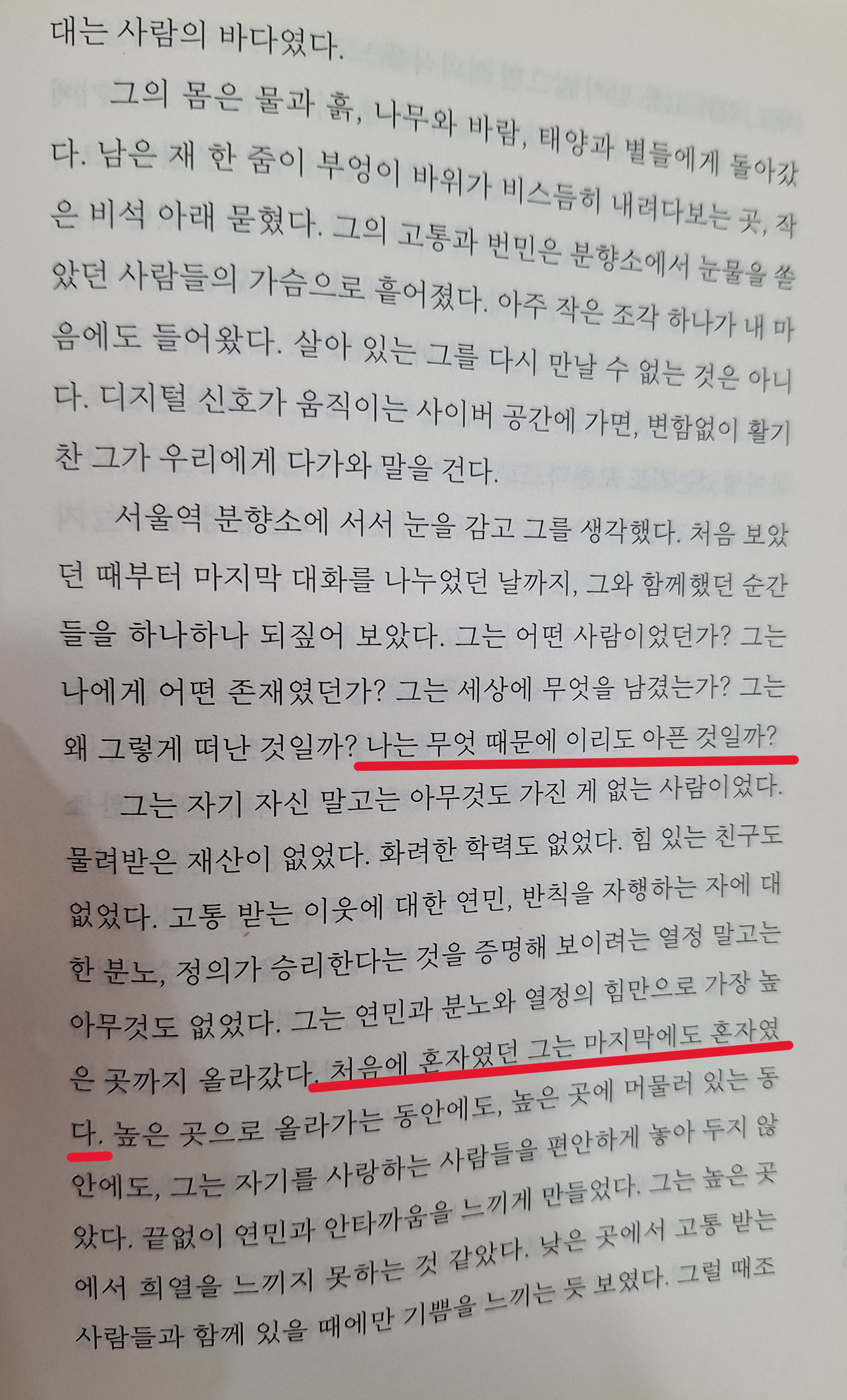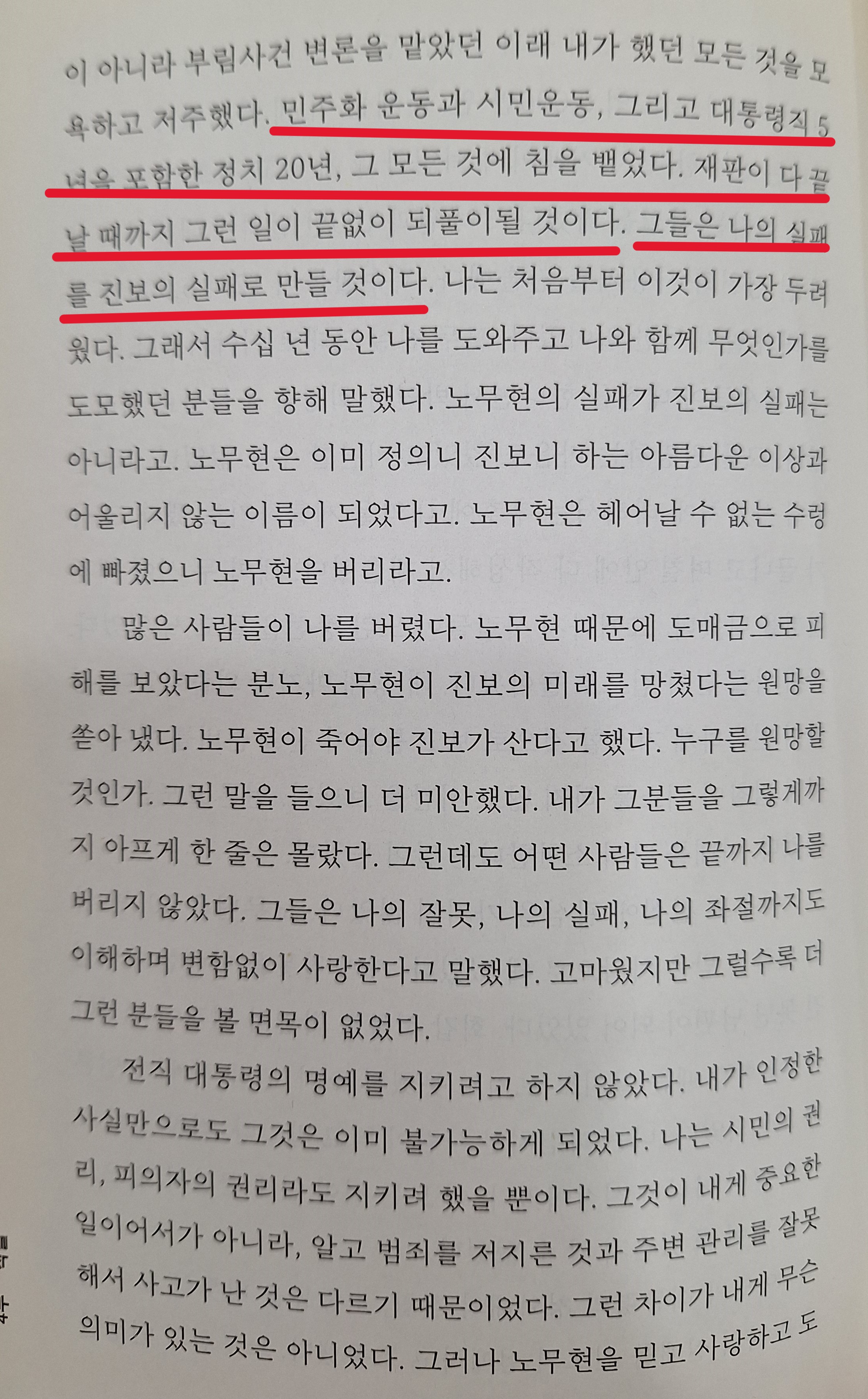 (그가 부엉이 바위에 오르기까지) 모든 일들을 직접 간접 함께 체험한 끝에 내 마음에 남은 감정은 분노와 절망감이었다. 세상이 무서웠다. 사람이 싫어 졌다. 민주주의, 자유, 정의, 진보, 조국, 이런 말을 들어도 더는 가슴이 설레지 않았다.