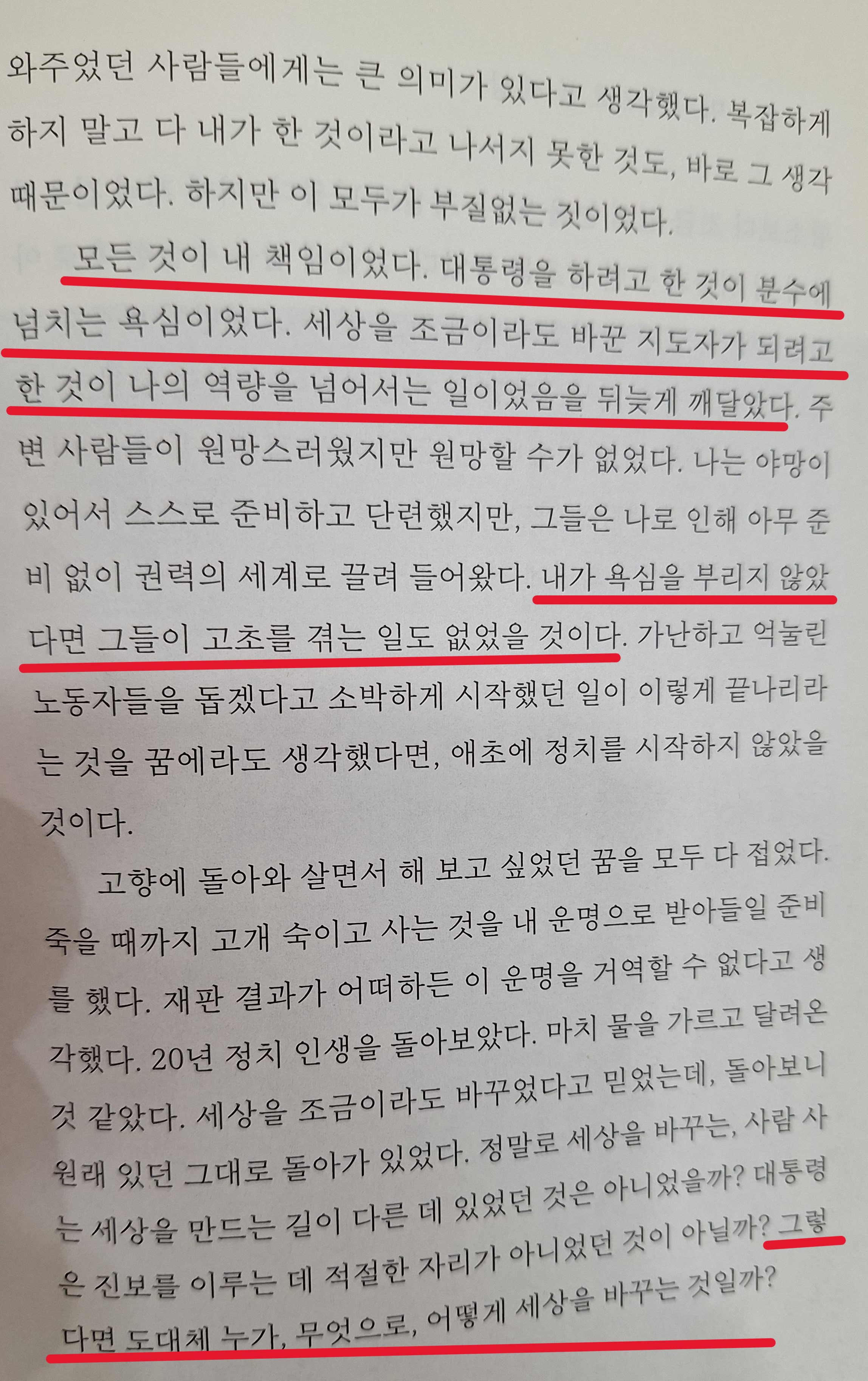 (권력의 이면에는 국민 누구에겐가 억울하고 불행한 일이 생기면) 모두가 대통령 잘못인 것처럼 느끼게 만드는 부담감이 놓여 있다. 비가 오지 않아도, 비가 너무 많이 내려도, 다 내 책임인 것 같았다. 아홉시 뉴스를 보고 있으면 어느 것 하나 대통령 책임이 아닌 것이 없었다. 대통령은 그런 자리였다. - 이런 마음을 안 가지는 대통령이 많다 ㅠㅠ