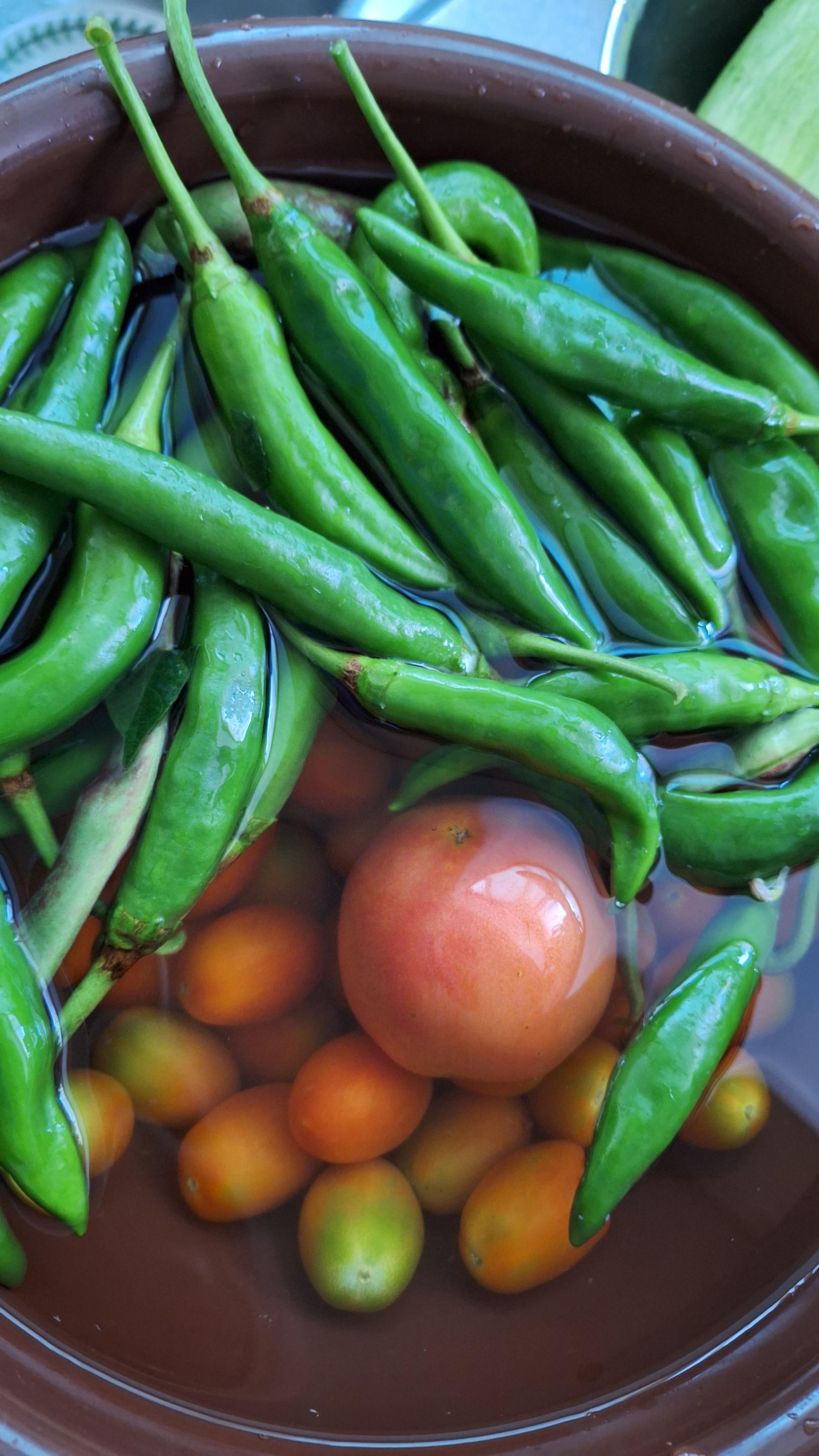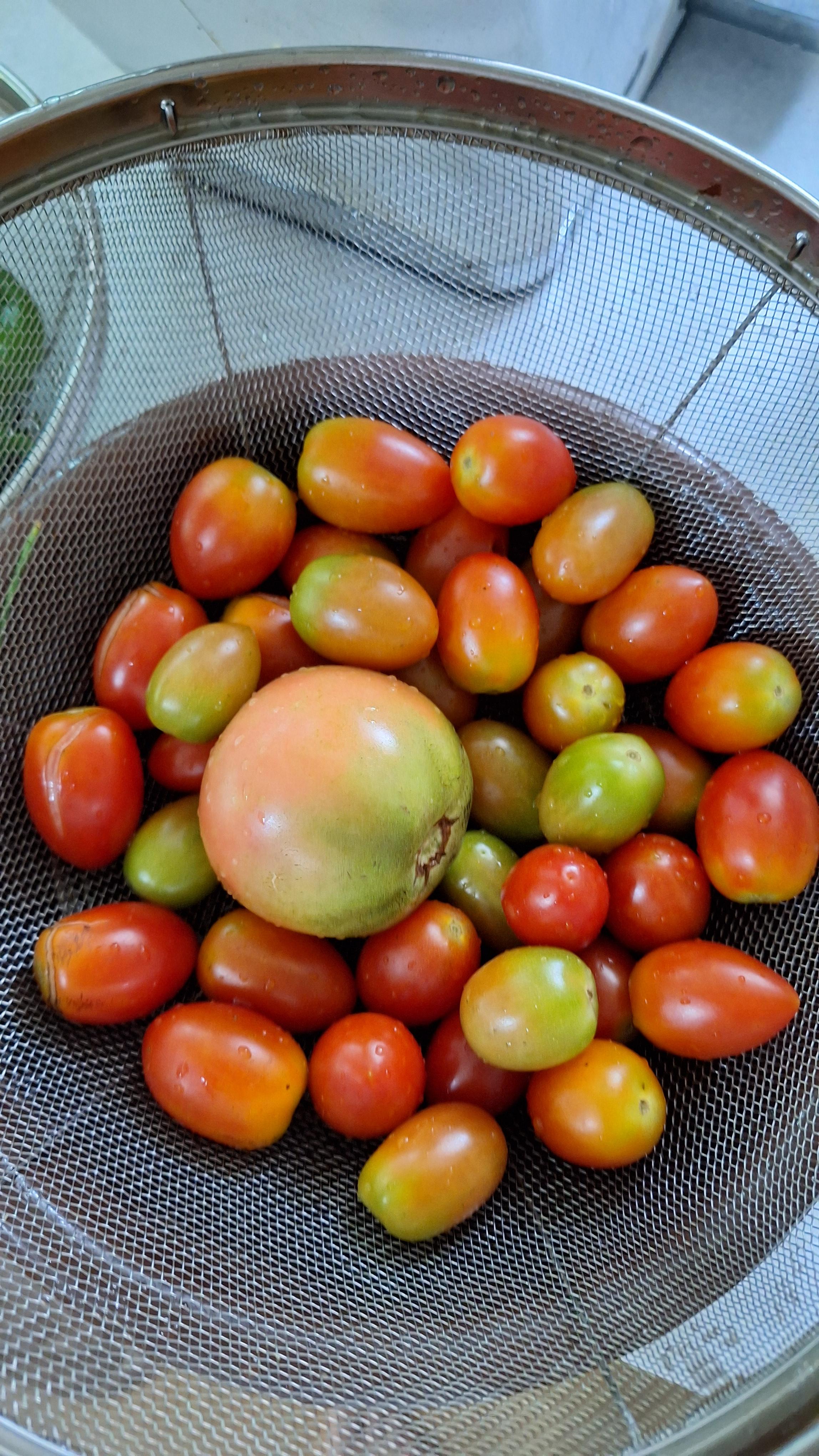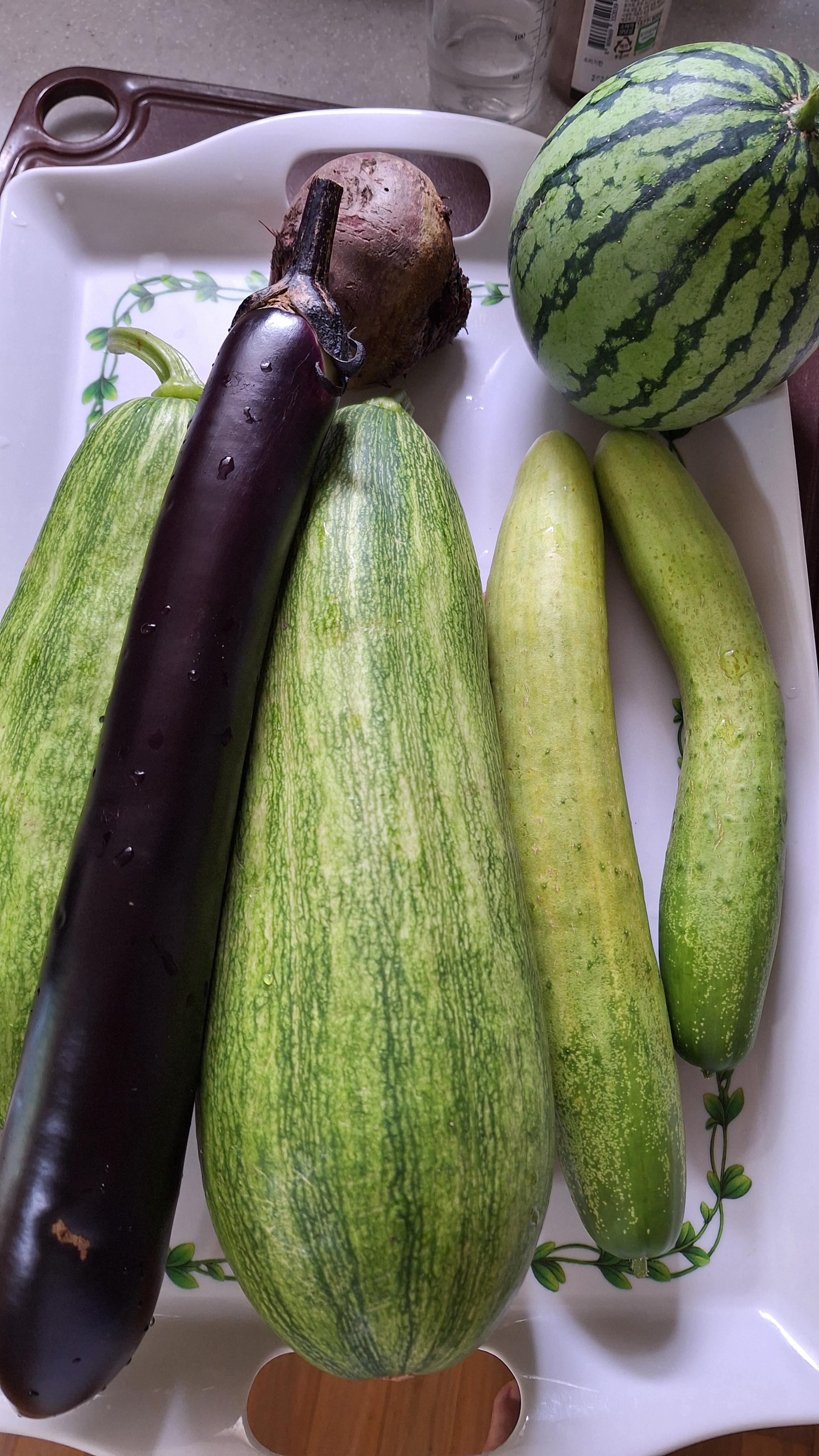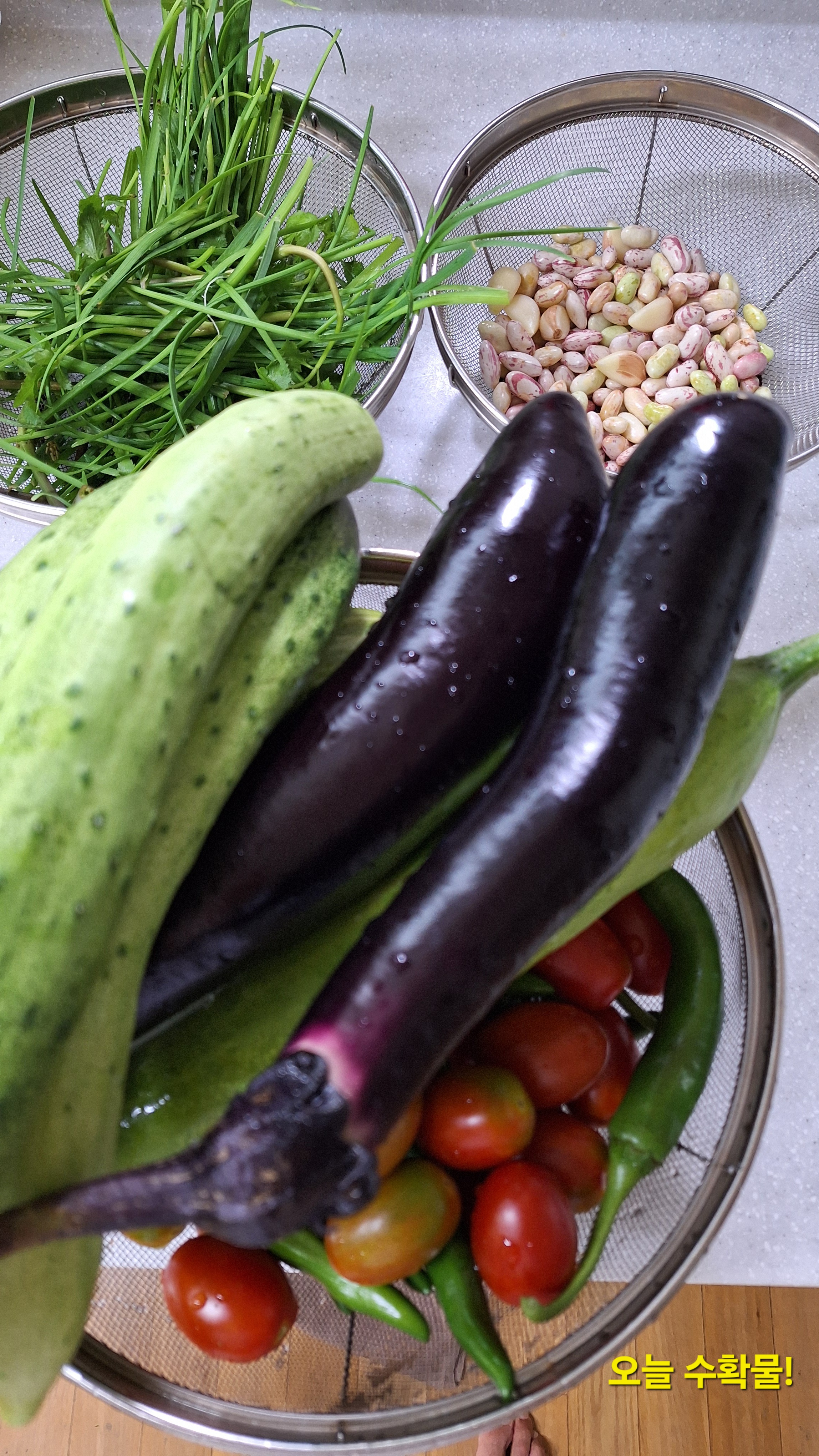 엄청나게 큰 애호박(어른 호박임) 3개, 가지 2개, 애플 수박 1개, 오이 3개, 방울토마토와 고추를 수확했습니다. 수확할 때마다 그 기쁨은 이루 말할 수가 없습니다. 내가 모종을 사서 심은 다음 잘 가꿔 얻은 결과물이니까 더욱 기분이 좋습니다. 수확한 것을 잘 정리한 다음, 호스를 이용하여 텃밭을 촉촉하도록 물을 주었습니다. 오후에 비가 온다고 했는데 느낌상 많이 안 올 것 같아서 물을 주었습니다. (잘한 선택이었습니다. 오후에 비가 오지 않았습니다. ^^)