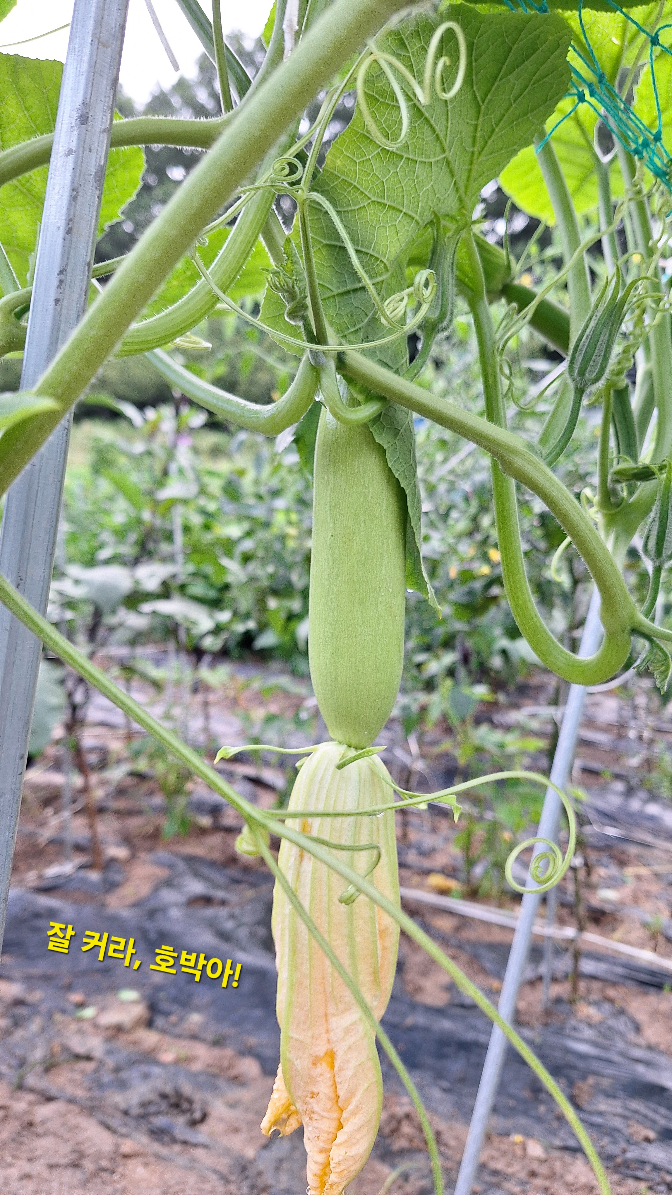 애호박의 성장세가 엄청 납니다. 올해 애호박을 매주 2~4개씩 공급해주고 있는데, 여전히 가지를 뻗고 열매를 달고 있습니다. 거미손과 곁순 들을 제거하여 열매의 품질이 좋아지도록 하고 있습니다. 가지와 호박, 방울토마토가 9월 가을까지 열매를 달 수 있도록 유박비료를 줬습니다.