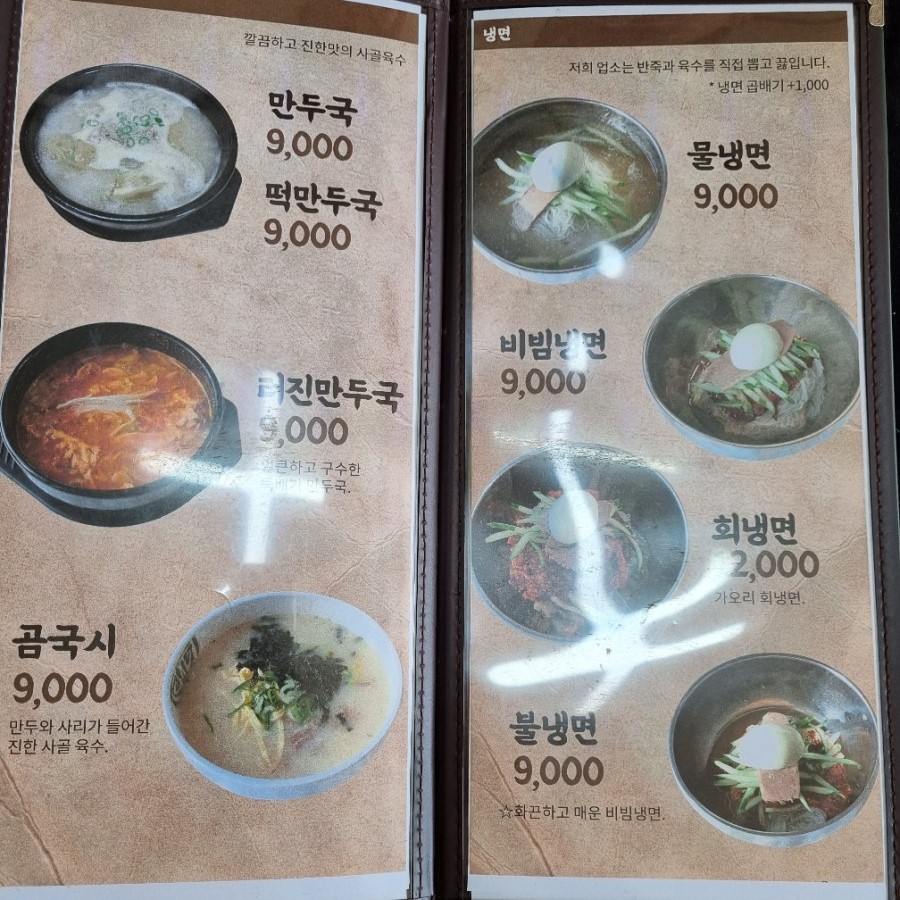 김치만두전골 10,000원, 만두버섯전골 10,000원, 물냉면 9,000원 등