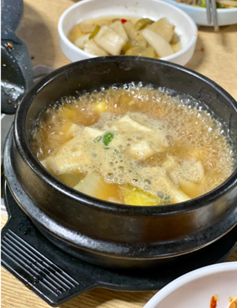 서비스로 나오는 야채 전, 된장찌개, 반찬 하나하나 다 맛있다.
