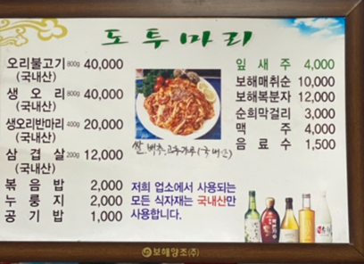 - 오리불고기, 생오리, 생오리반마리 등